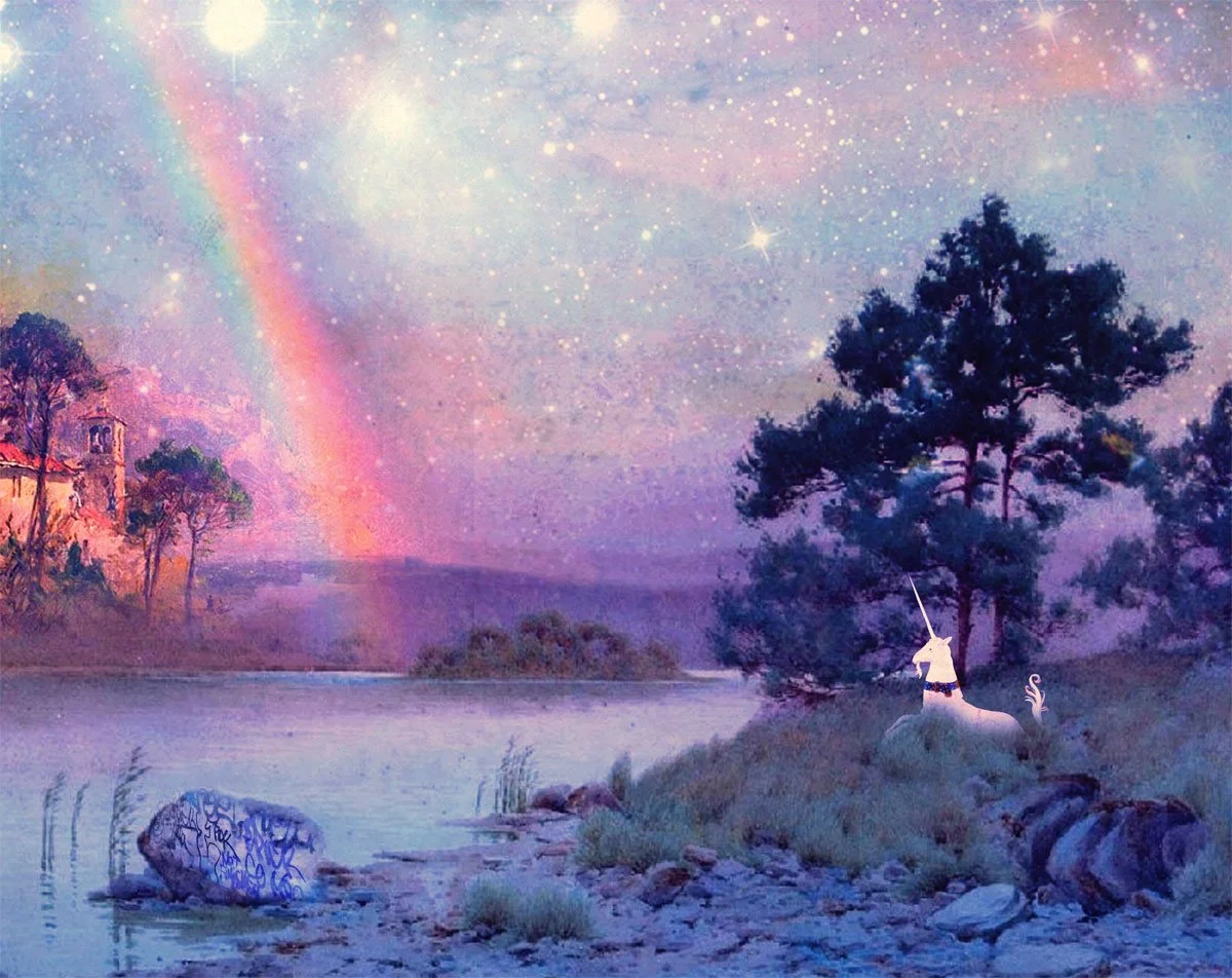 By contrast, Unicorn serves as the dreamy counterweight: a quiet, enchanted twilight world with a lone unicorn reclining by a riverbank, under a cosmos lit by soft stars and a rainbow. Here, the absurd becomes sublime—melancholy and still.